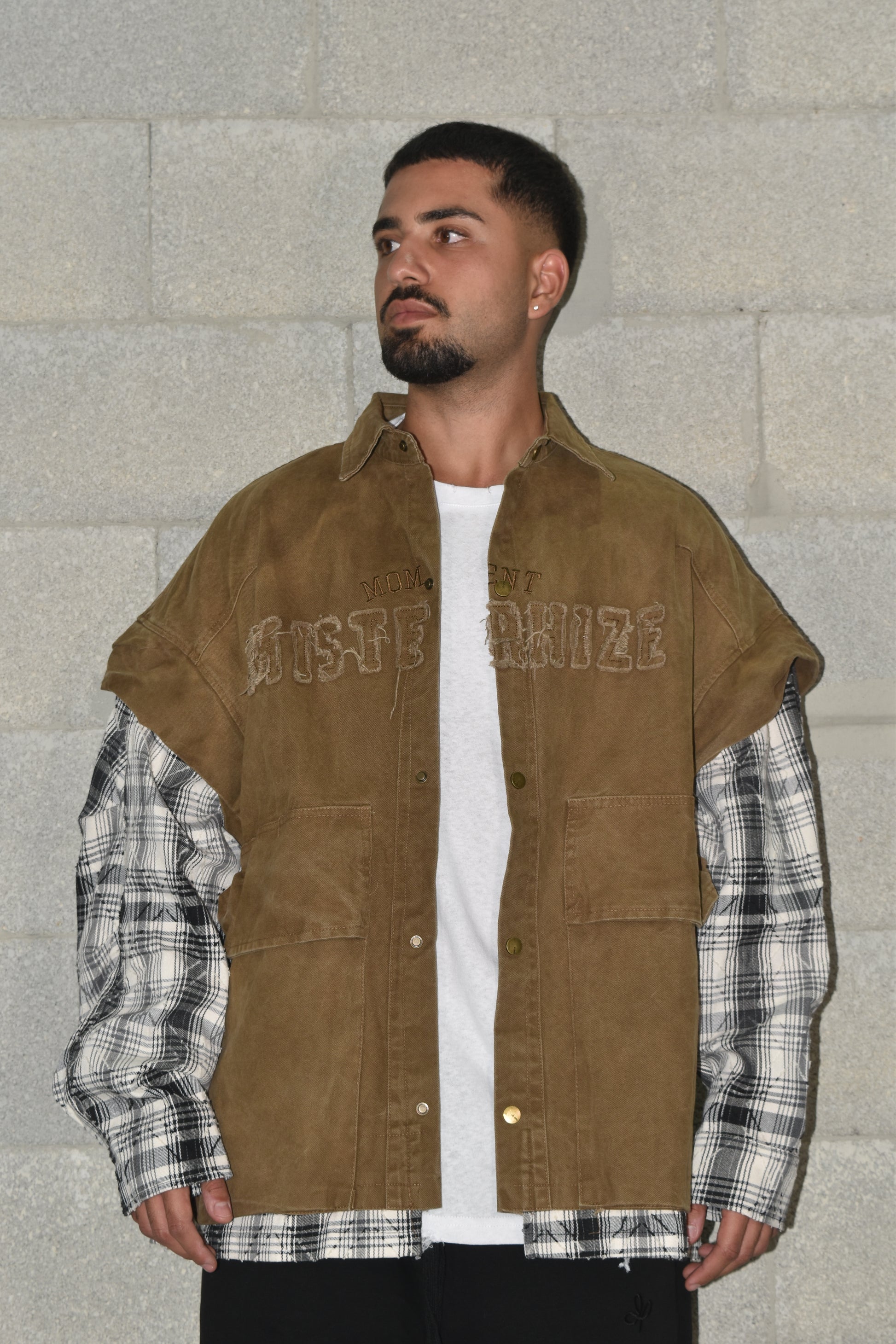 ג'קטג'ינס חום משופשף שרוולים אוברסייז שחור לבן מספיק חולצה לבנה ומכנס שחור וגנבת את ההצגה