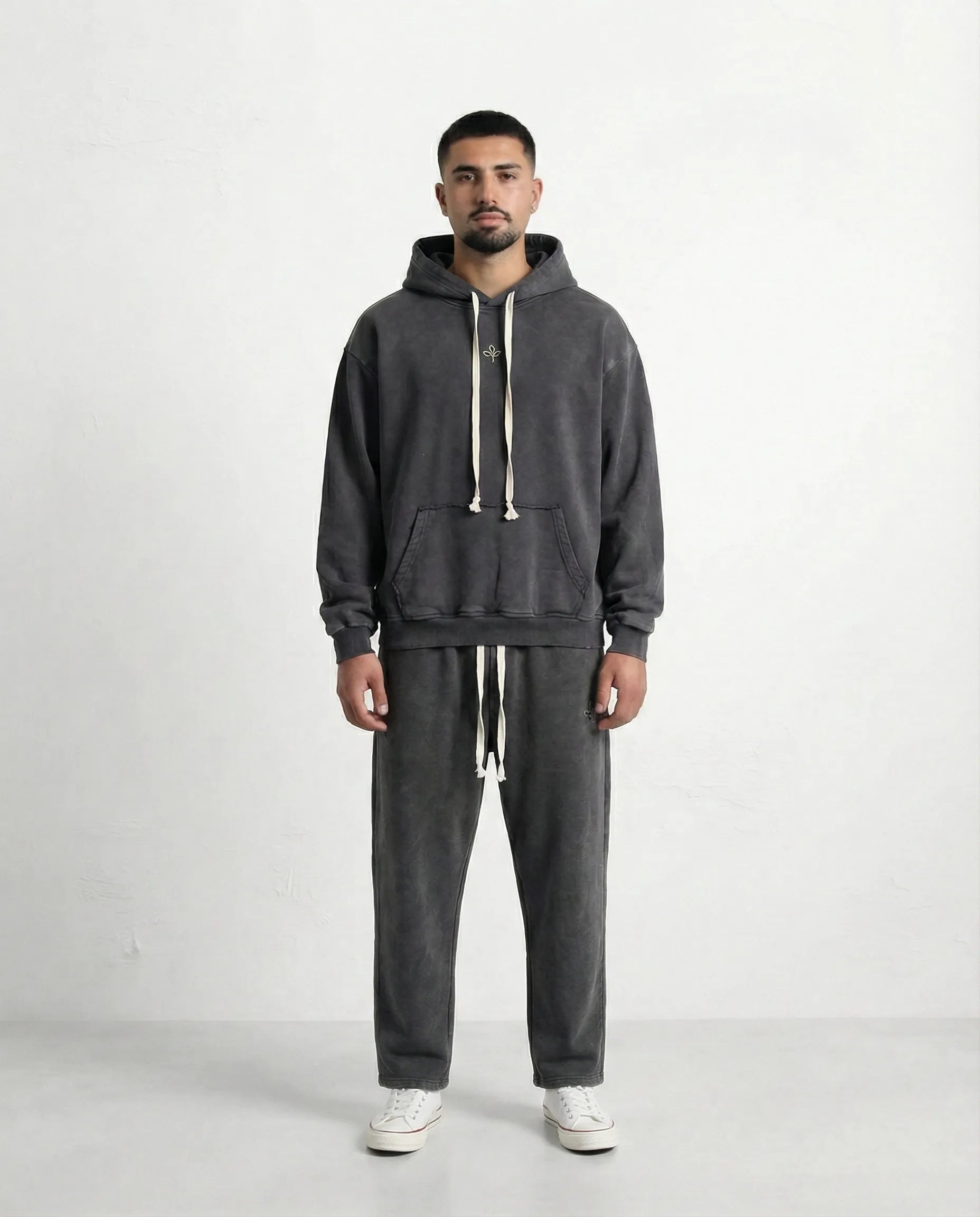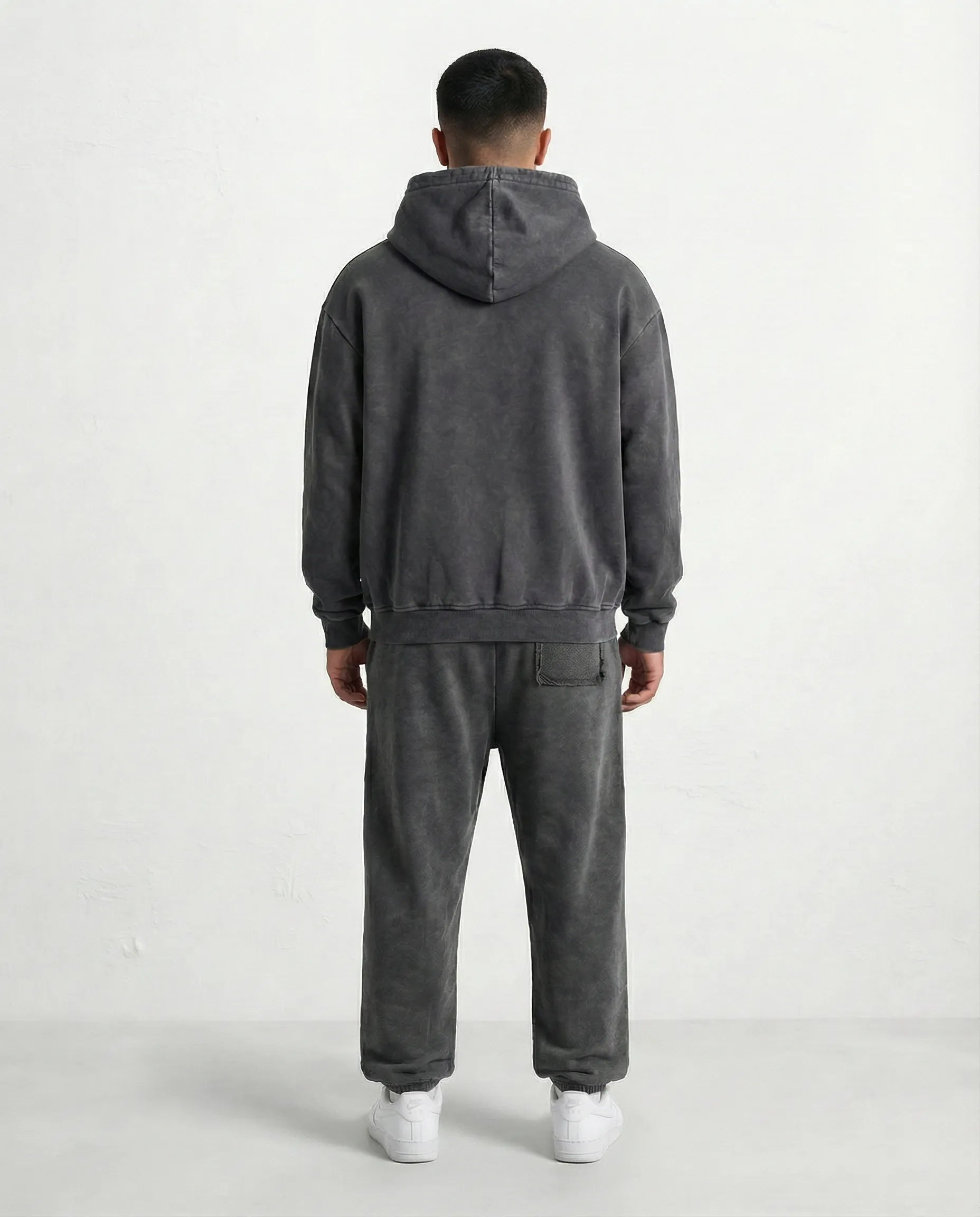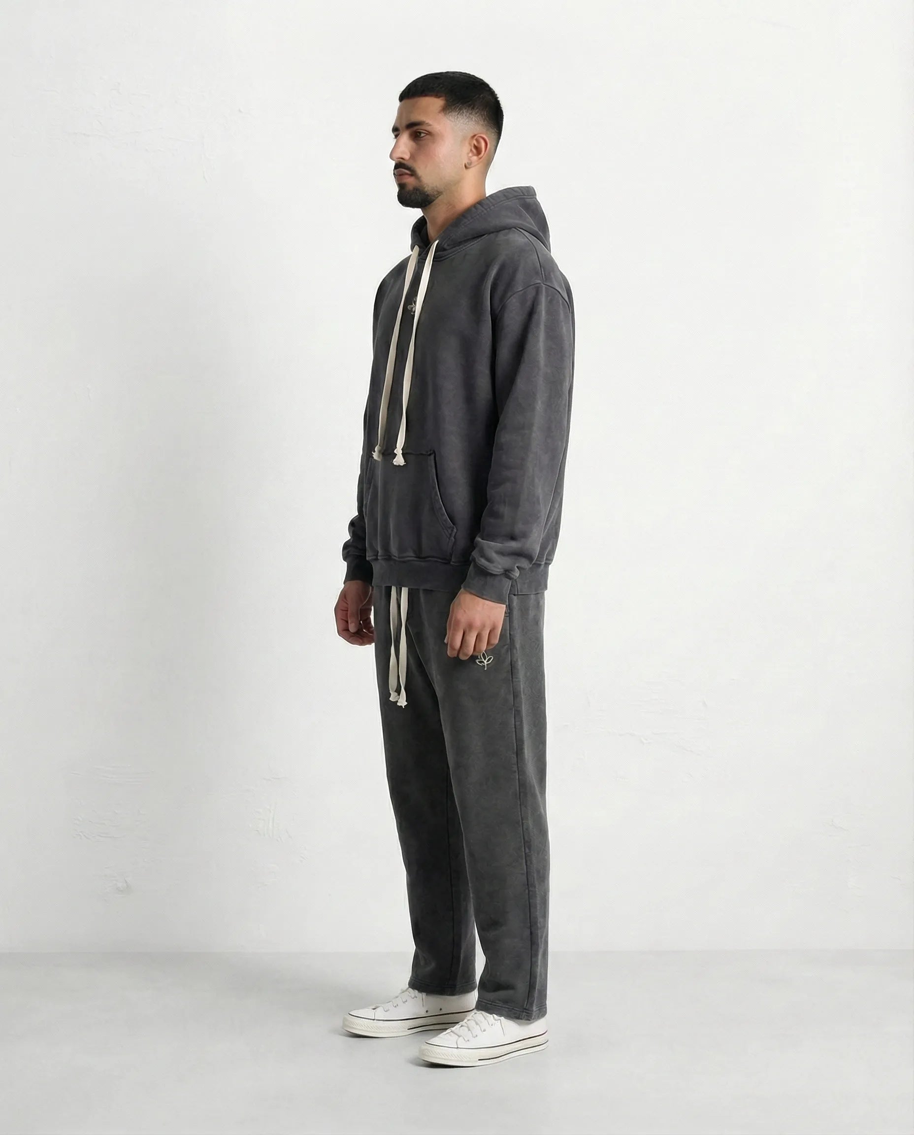 ;מכנס בגיזרת אוברסייז שחור וואש משתלב טוב עם הסווטשירט התואם