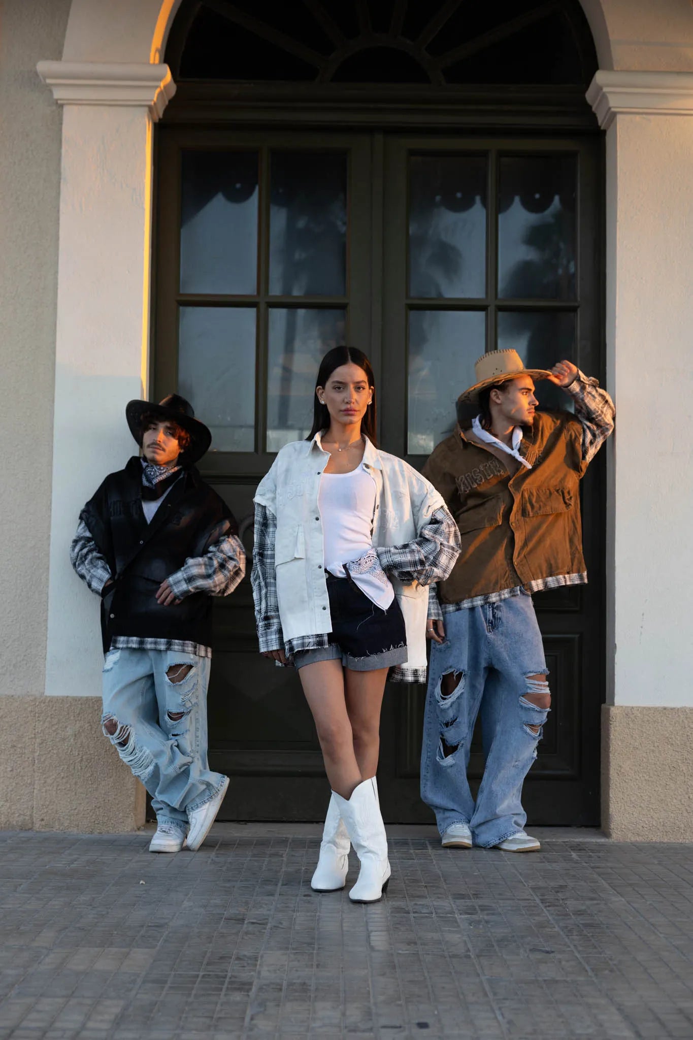 ג'קט ג'ינס שחור משופשף שרוולים אוברסייז שחור לבן מספיק חולצה לבנה ומכנס שחור וגנבת את ההצגה