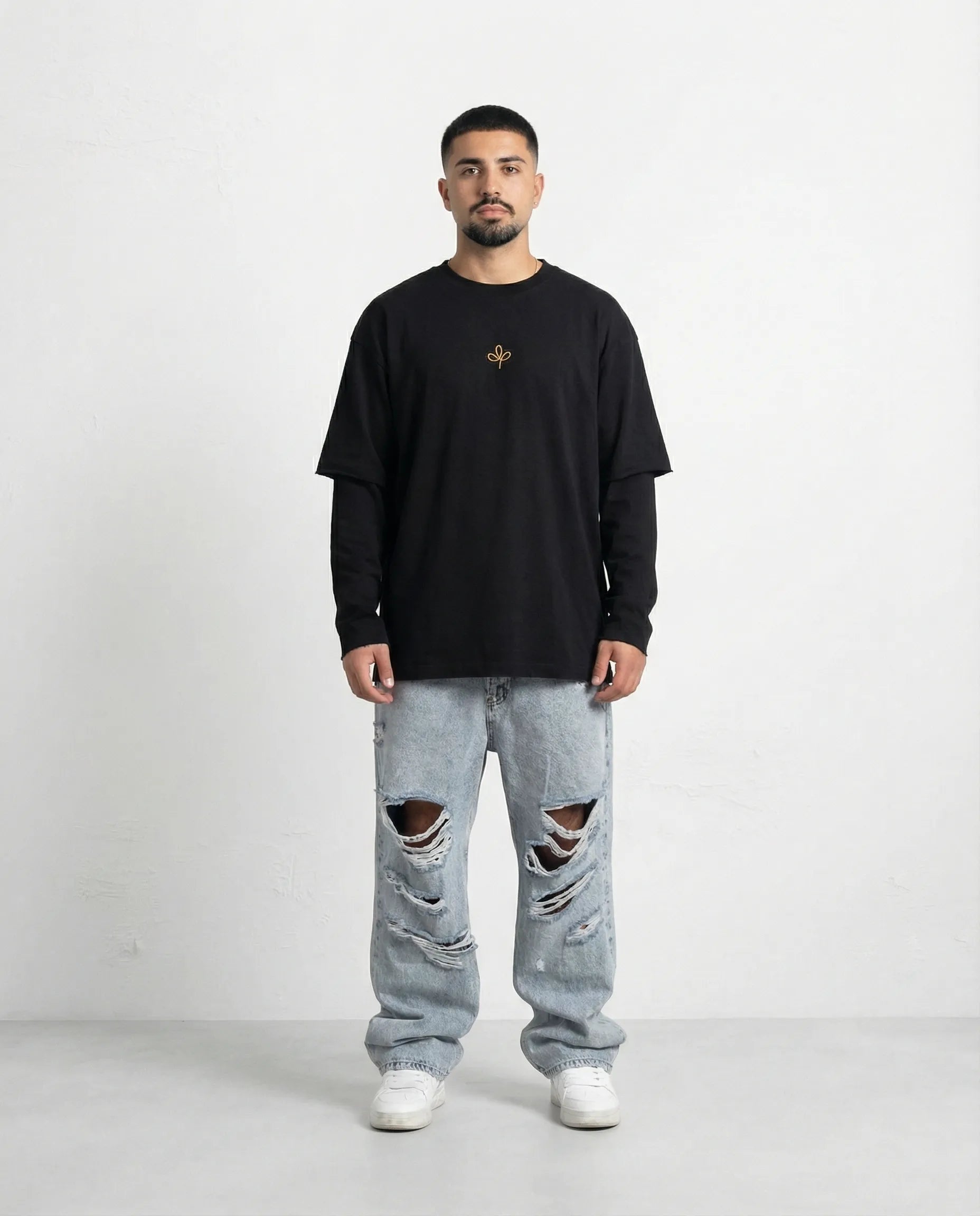 חולצה שחורה בד כפול, גזרת אוברסייז מראה אורבני. עשויה מבד כותנה נעים ואיכותי, מתאימה לשילוב עם ג׳ינס, מכנסיים קצרים או לוק שכבות.