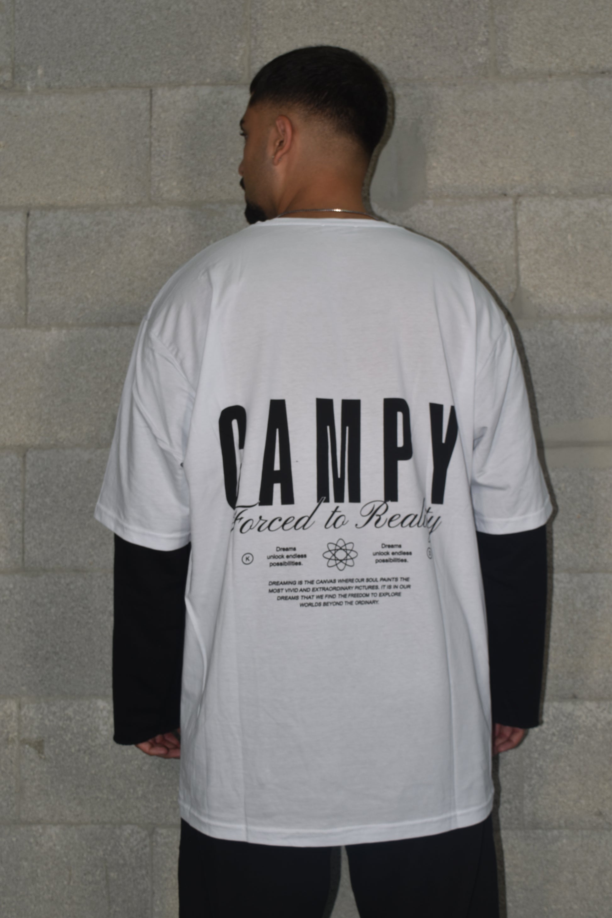חולצה חומה בד כפול עם הדפס לבן, גזרת אוברסייז מראה אורבני. עשויה מבד כותנה נעים ואיכותי, מתאימה לשילוב עם ג׳ינס, מכנסיים קצרים או לוק שכבות.