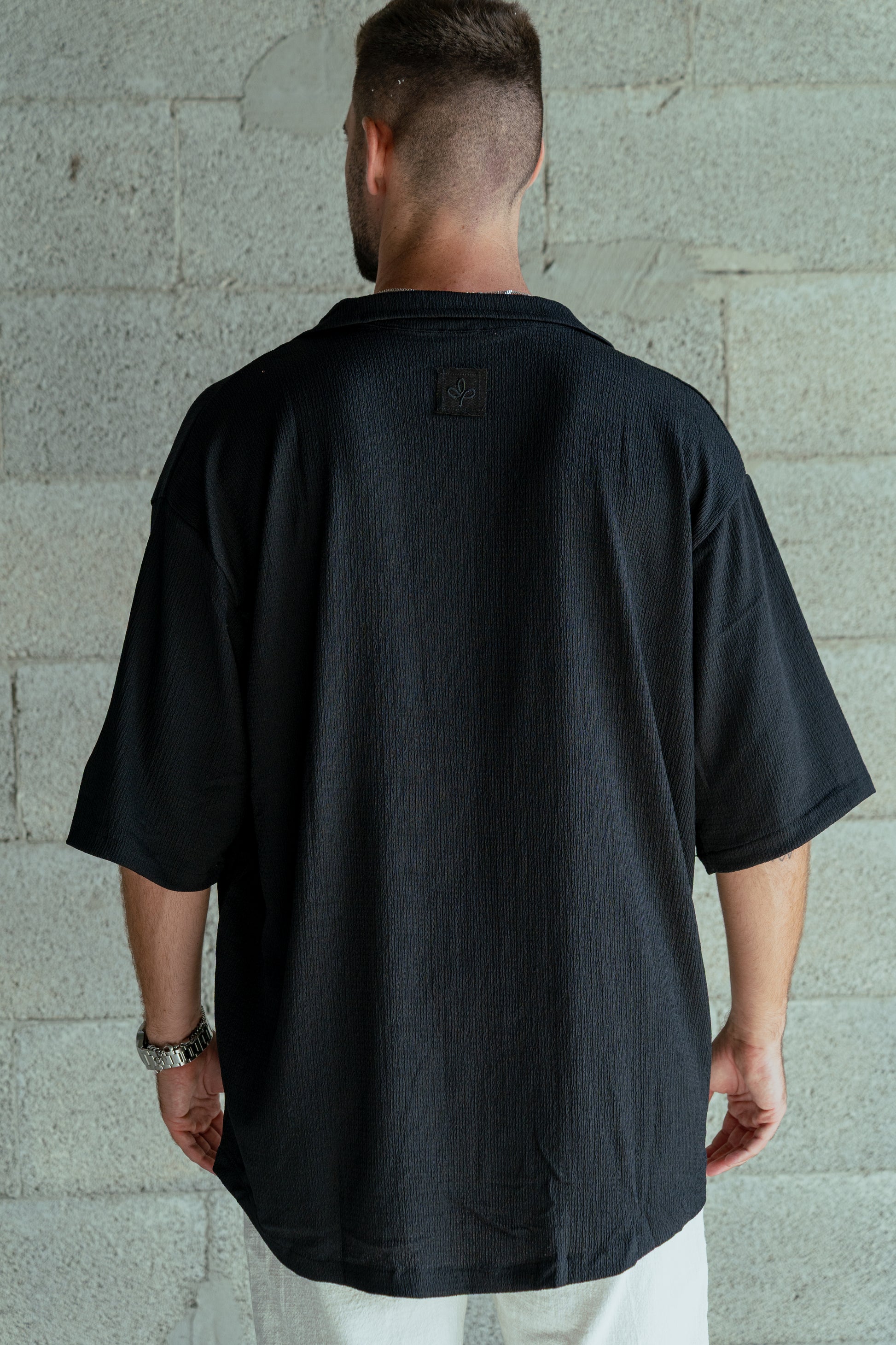 מכופתרת שחורה בד עם טקסטורה מעניק מראה אורבני ואופנתי.
