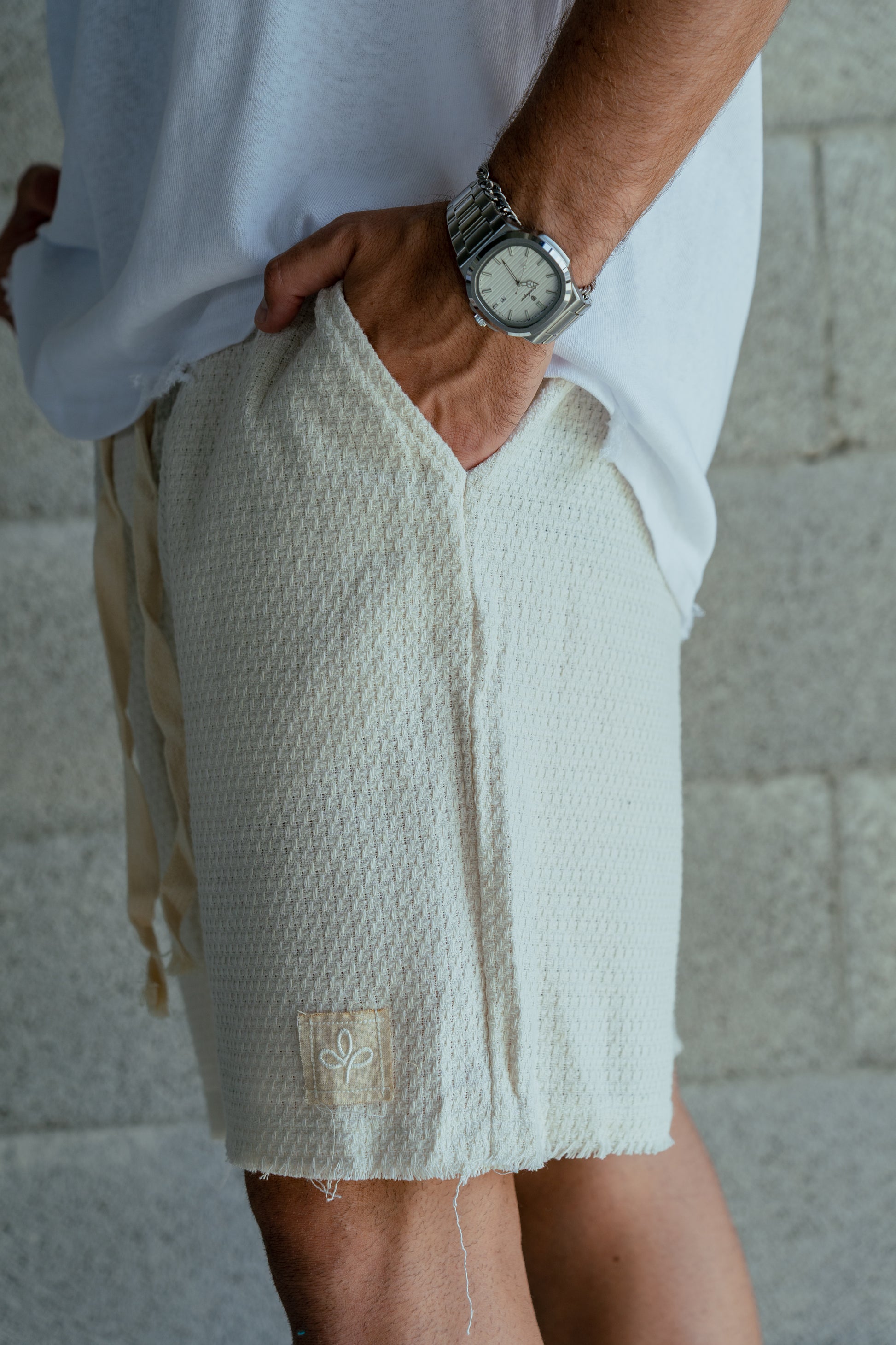מכנס לבן בגווני עם שרוך חבל עבה בגוון טבעי, בגזרה אוברסייז