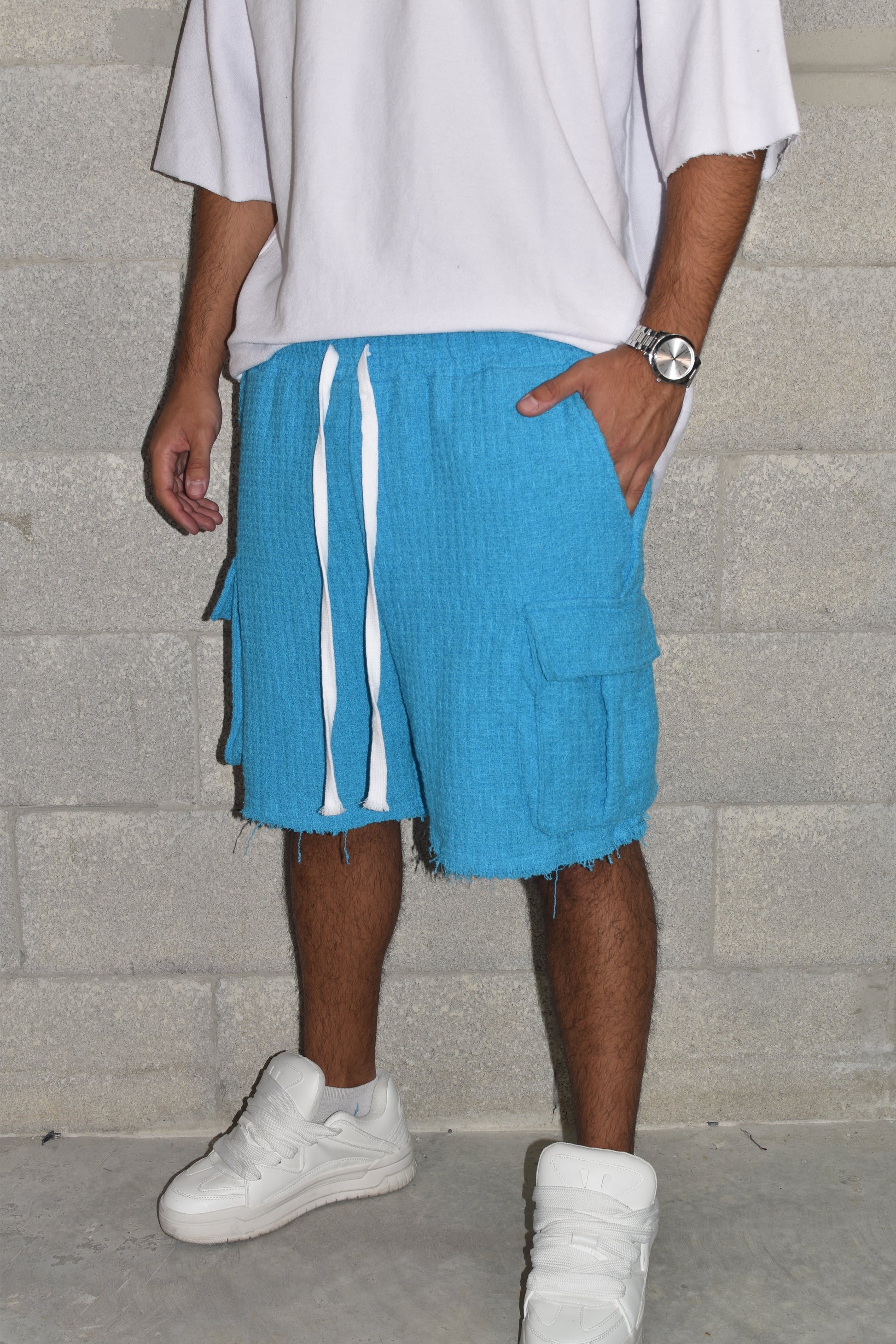 שורט כחול כיסים בצדדים עם שרוך חבל עבה בגוון טבעי, בגזרה אוברסייז
