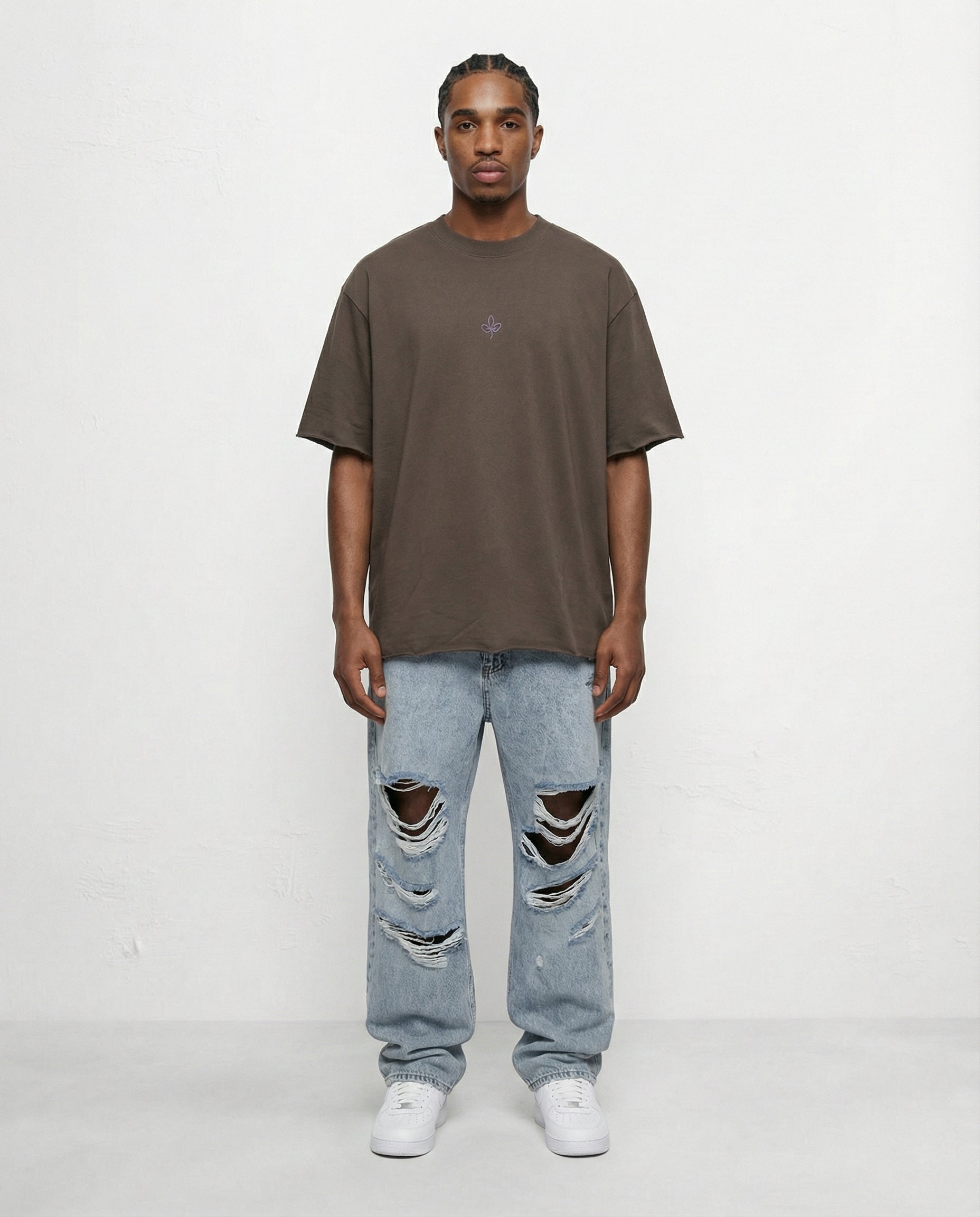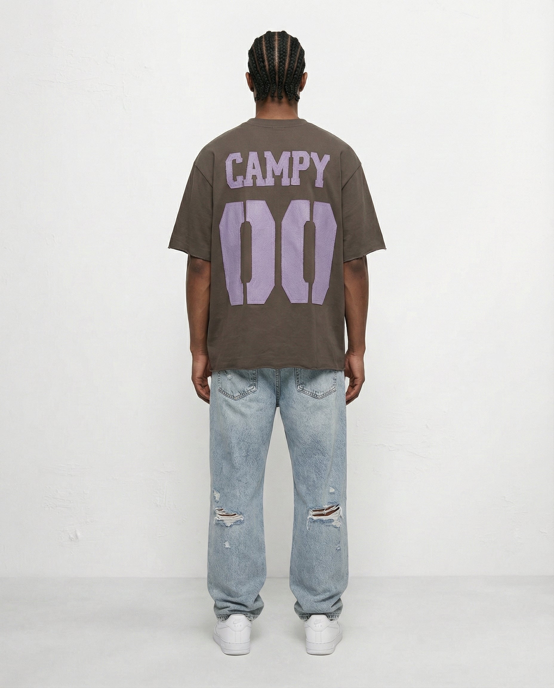 "חולצת טי שירט לבנה מבד כותנה איכותי, בגזרה רחבה ומעודכנת. החלק הקדמי עם לוגו קטן ומינימליסטי, והגב עם תפירת בד גרפי בולט CAMPY 00 למראה ספורטיבי ואורבני. מושלמת לשילוב עם ג'ינס קרעים, שורטים או אאוטפיט יומיומי בסטייל."