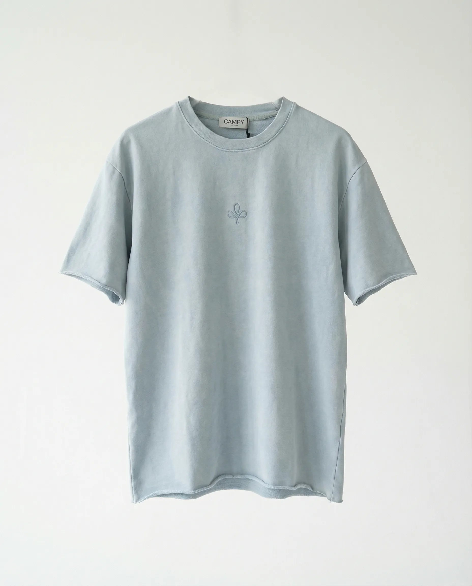 "חולצת טי מבד כותנה איכותי, בגזרה רחבה ומעודכנת. החלק הקדמי עם לוגו קטן .ומינימליסטי, והגב עם תפירת בד גינס בולט CAMPY 00 למראה ספורטיבי ואורבני. מ