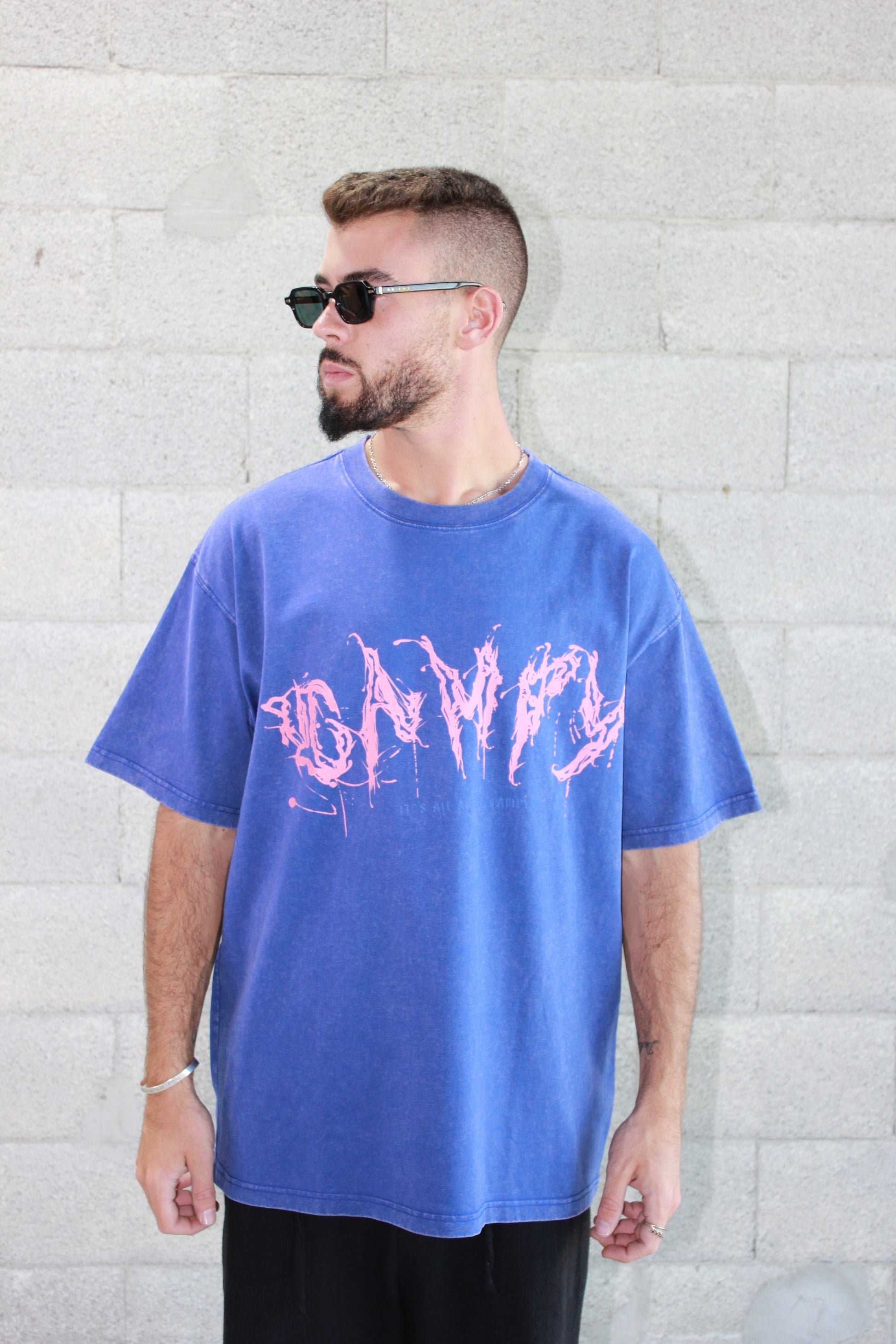 טי שירט בצבע כחול וואש בגזרת אוברסייז, עם הדפס. בד כותנה איכותי ונעים על הגוף, מתאים לשילוב יומיומי עם ג’ינס או מכנסי קיץ. חולצה שכולה סטייל.