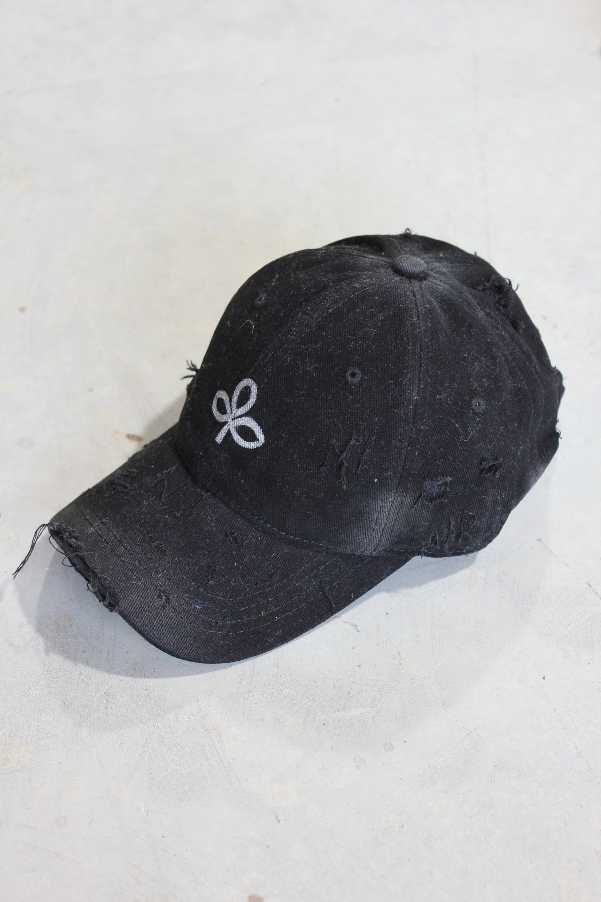 כובע בצבע שחור עם שפשופים בולטים, ולוגו אפור – שילוב של נוכחות ועיצוב מחוספס.